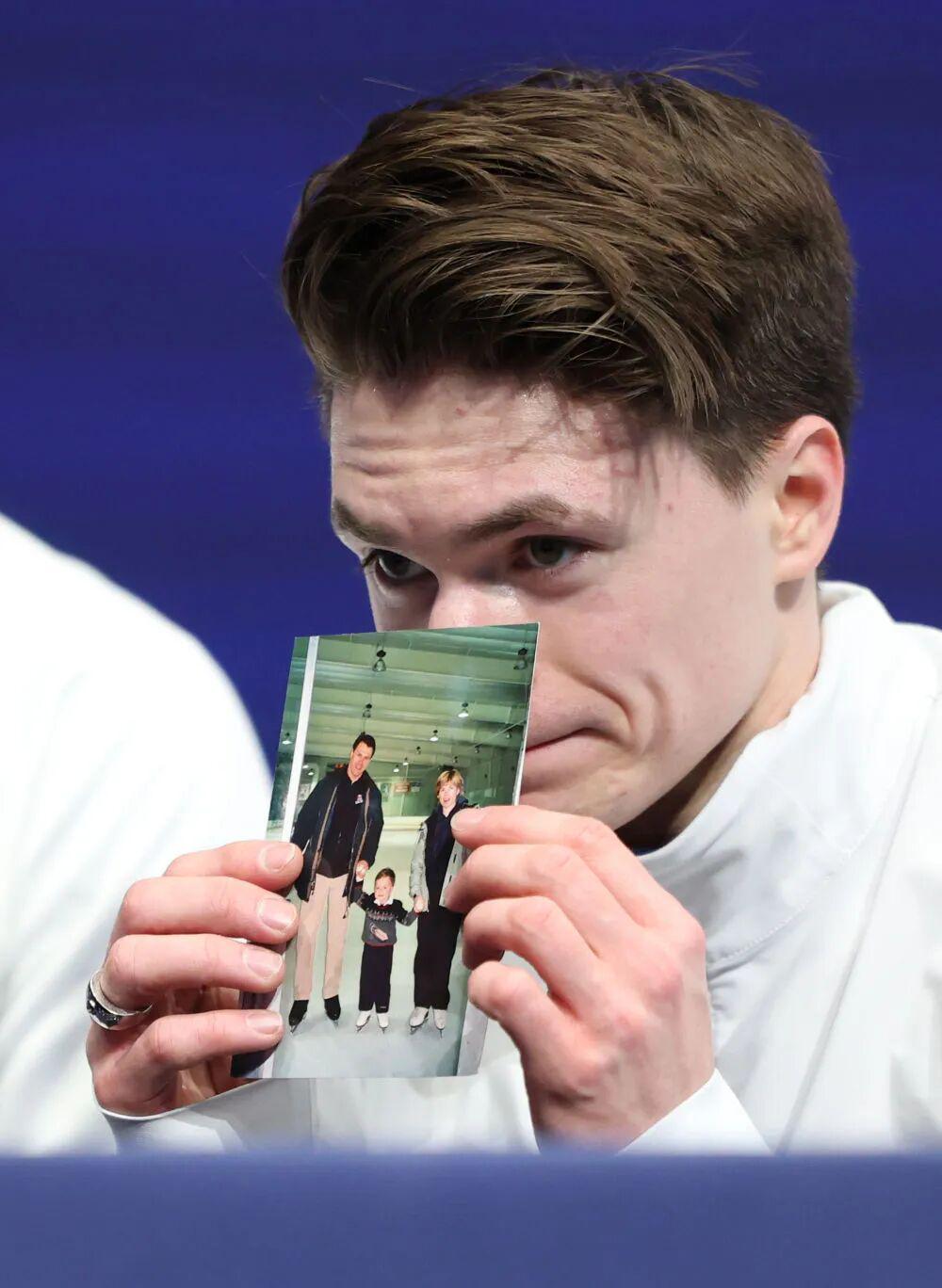 2月10日,美国选手马克西姆·瑙莫夫赛后在等分区手持一张旧照片。新华社记者 李明 摄