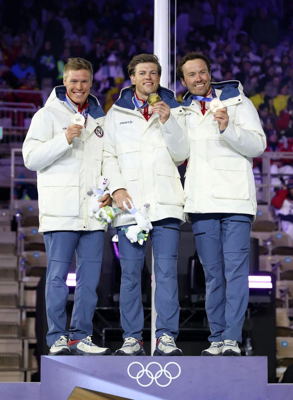 2月22日,越野滑雪男子50公里集体出发(传统技术)冠军挪威选手克莱博(中)、亚军挪威选手尼格特(左)和季军挪威选手伊韦尔森在闭幕式现场举行的颁奖仪式上。新华社记者 李明 摄