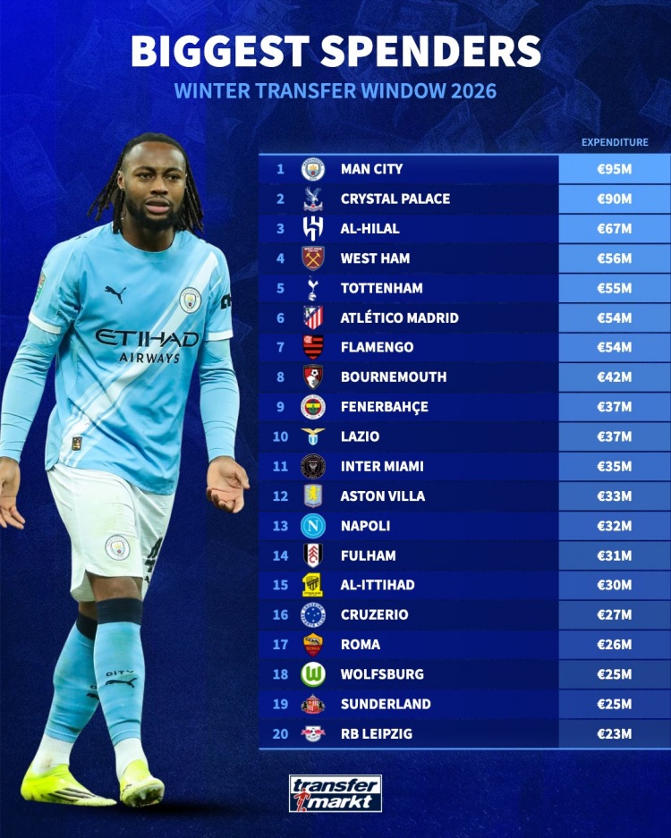 冬窗引援花费排行:曼城9500万欧居首,迈阿密国际3500万欧第11